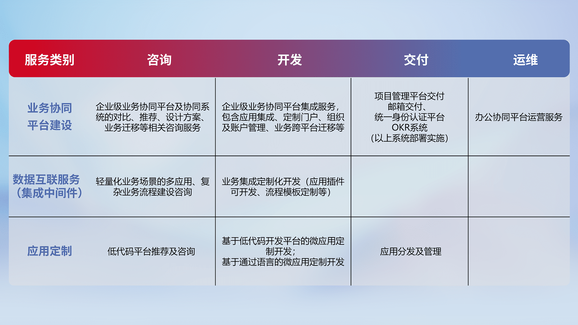 针对钉钉、、、、企微、、IDaas等平台级产品提供产品的规划、、、、方案、、交付、、定制化开发等服务,,,实现如统一协同办公、、、、智能客户服务、、、混合会议管理、、智能数据查询、、、、等业务场景,,,实现数字化转型。。。。